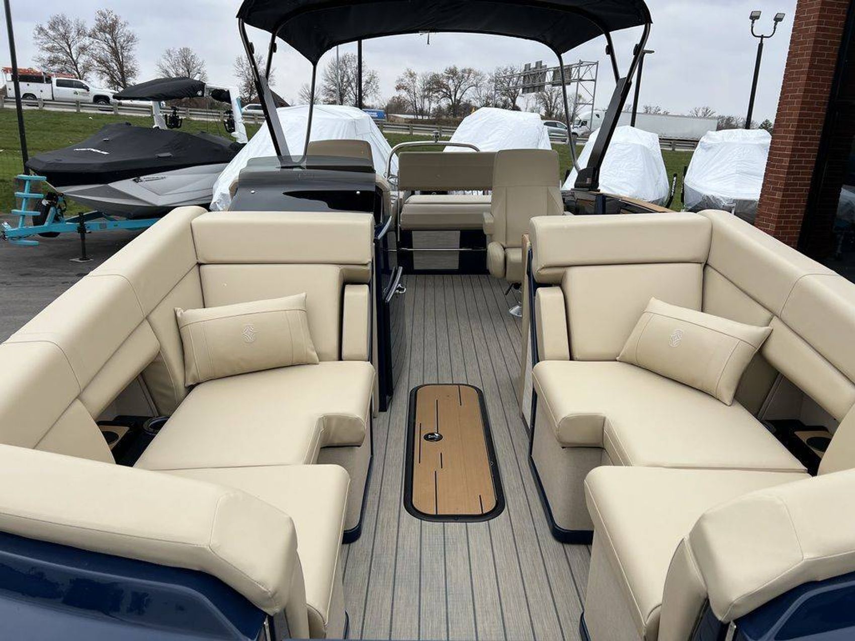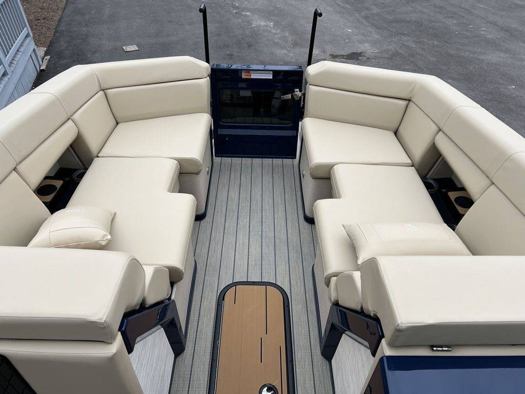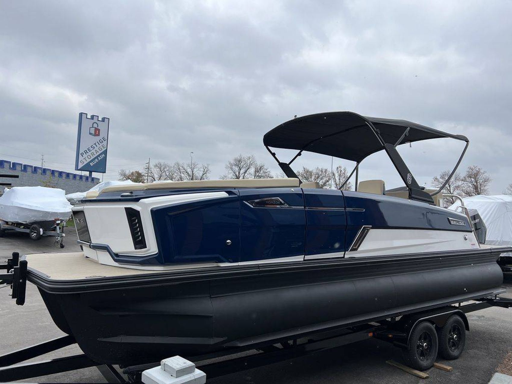 The 2025 Balise Horizon Pontoon Boat exudes elegance with its sophisticated, aerodynamic design, exquisitely complemented by a plush interior. Featuring an expansive deck layout with comfortable and inviting seating for optimal relaxation, the boat allows for great views of the surroundings and comfortable interactions amongst passengers.