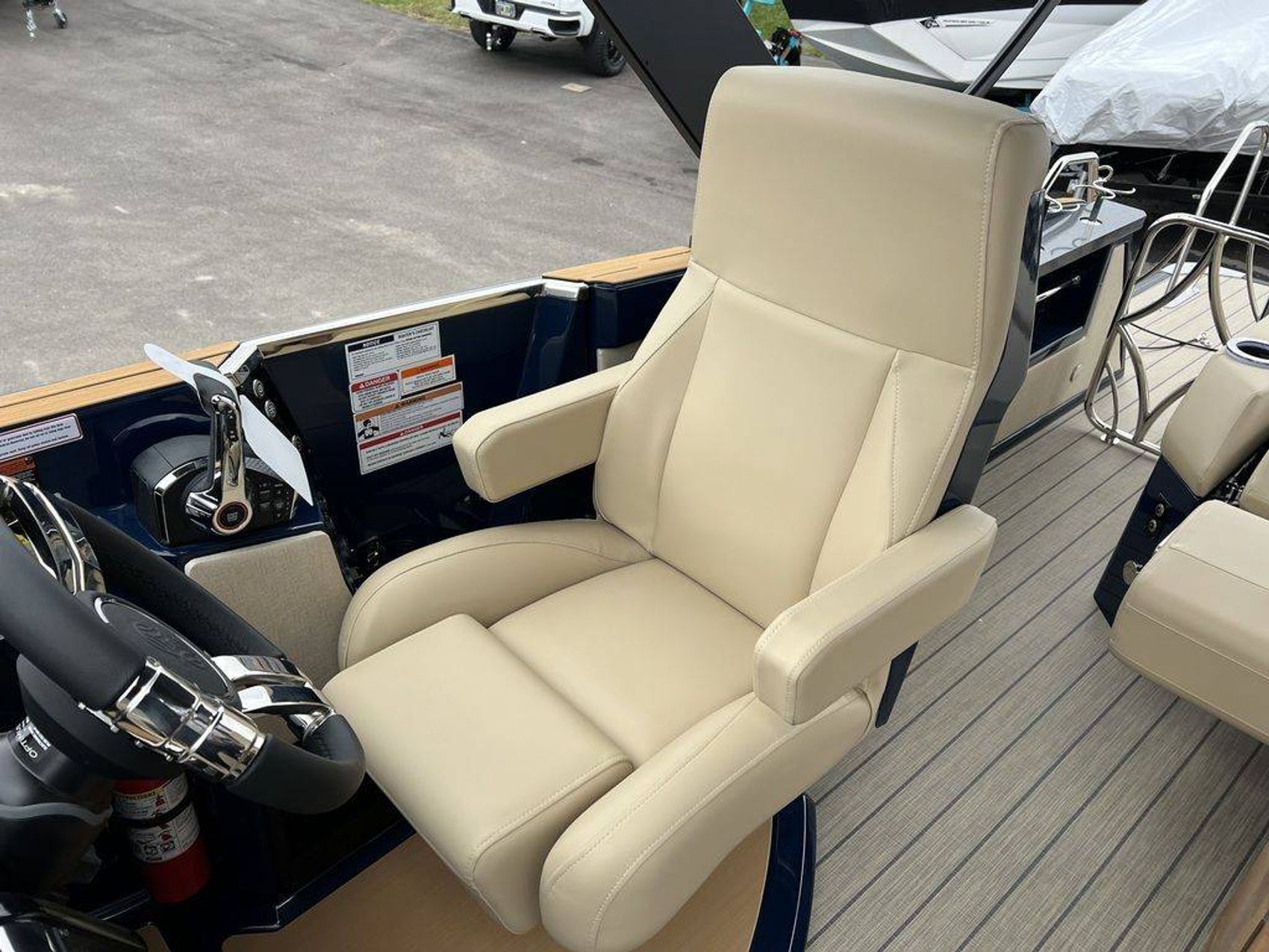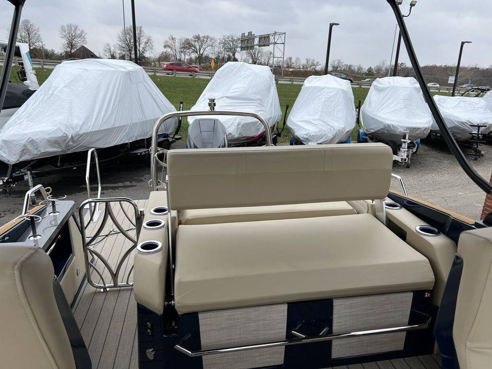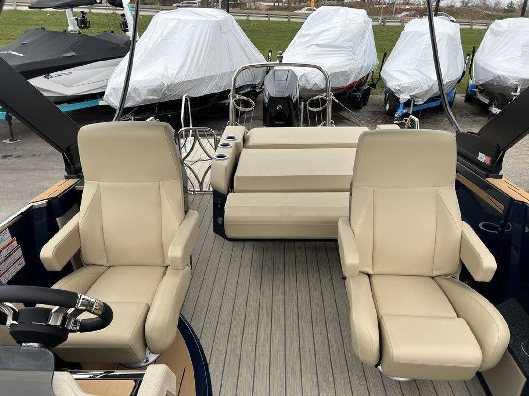 The 2025 Balise Horizon Pontoon Boat exudes elegance with its sophisticated, aerodynamic design, exquisitely complemented by a plush interior. Featuring an expansive deck layout with comfortable and inviting seating for optimal relaxation, the boat allows for great views of the surroundings and comfortable interactions amongst passengers.