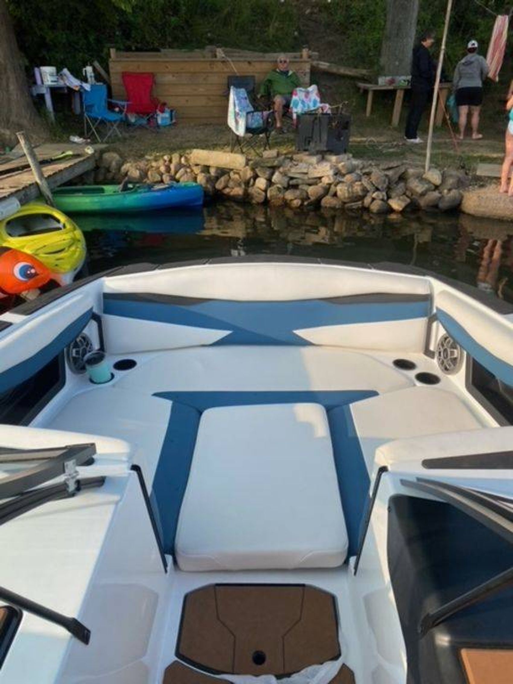 - The bow and lounge area feature spacious hinged storage compartments, discreet cupholders, premium Wet Sounds Speakers, and grab handles that offer easy access when you need them.